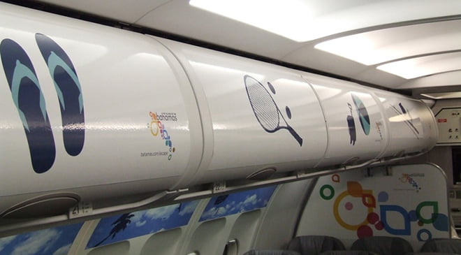 • Quảng cáo được in trên cabin chạy xuyên suốt dọc chiều dài bên trong tàu bay.